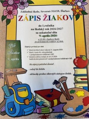 Prihlášky do materskej školy Ďurkov sa podávajú od 1. mája do 31. mája 2026. Osobné pohovory so zákonnými zástupcami sa uskutočnia 11. a 12. mája 2026.