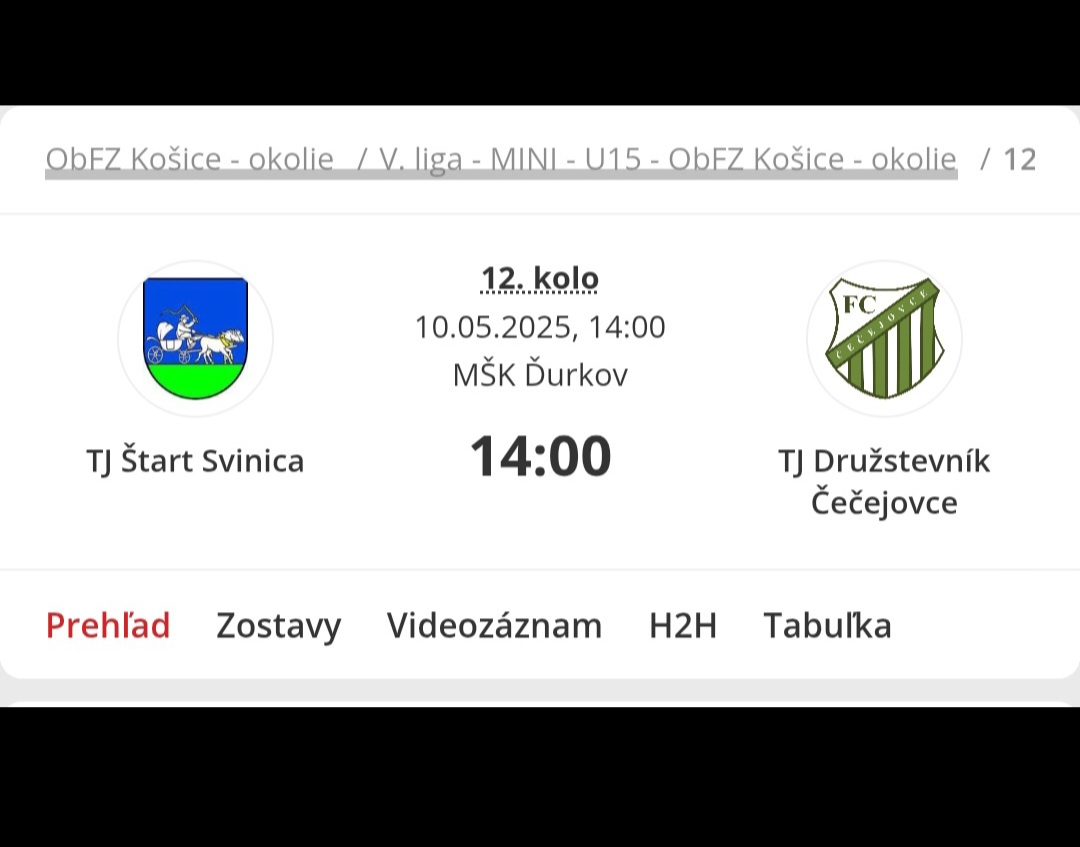 Dňa 10. mája o 14:00 sa na miestnom futbalovom ihrisku uskutoční zápas piatej ligy minižiakov medzi TJ Štart Svinica a TJ Družstevník Čečejovce.