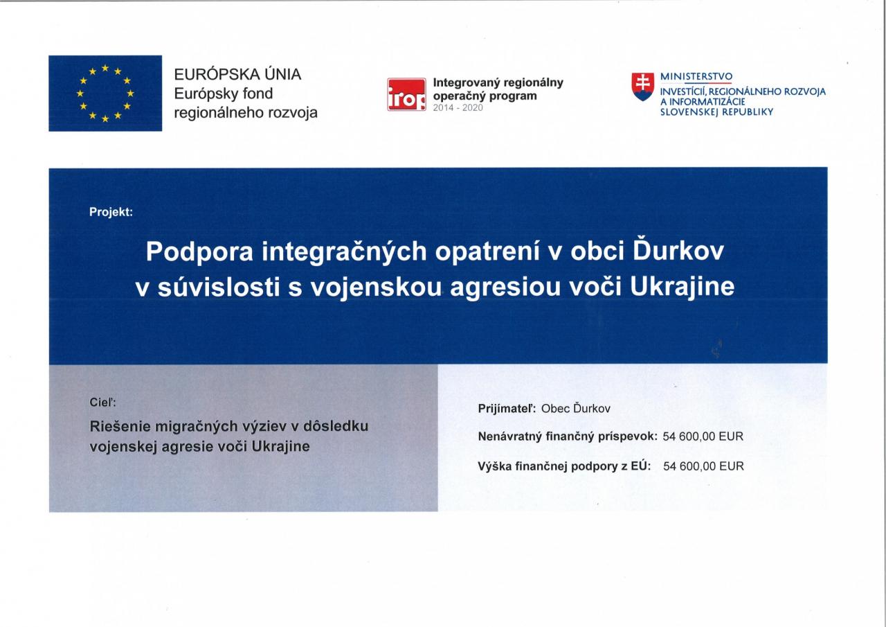 Podpora integračných opatrení v obci Ďurkov v súvislosti s vojenskou agresiou voči Ukrajine